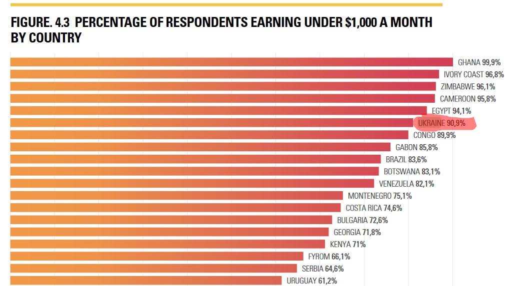 В ходе исследования было опрошено более 14 тысяч футболистов из 54-х стран мира. В Украине 90.9% футболистов зарабатывают меньше 1000 долларов в месяц. Более высокий процент только в пяти странах Африки.