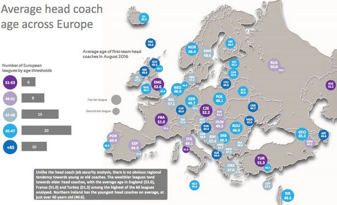 Средний возраст главных тренеров украинских клубов весьма низкий по европейским меркам и составляет 44,7 года.
